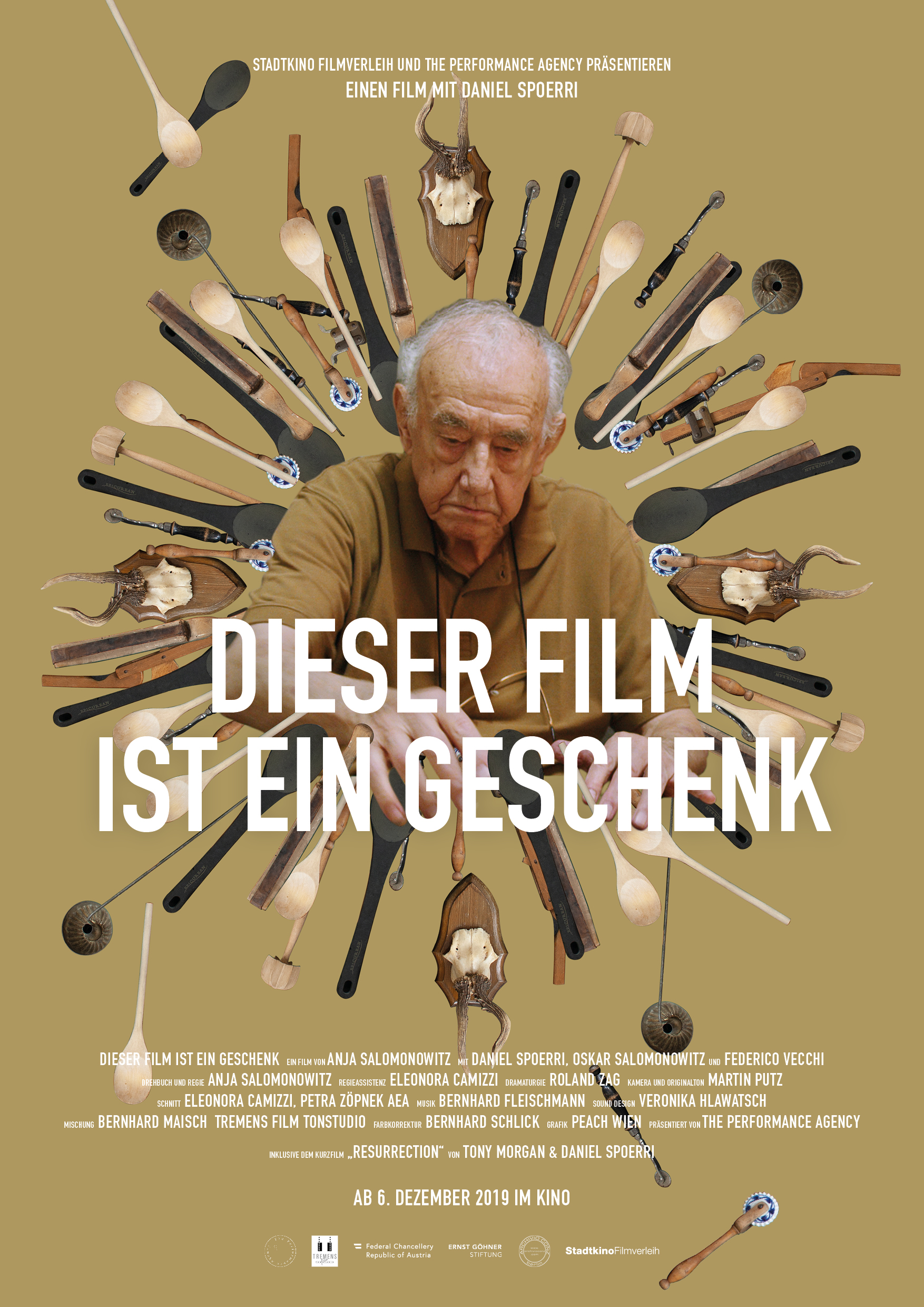 Daniel Spoerri macht Kunstwerke aus gefundenen Objekten, die ihre Funktion verlieren, sobald er sie in seine Bilder integriert. Anja Salomonowitz dreht Filme, die sich der Vergegenwärtigung von Zeiten und Konflikten widmen. Der Kreuzungspunkt der beiden ist „Dieser Film ist ein Geschenk“, eine Arbeit, die das Werk beider auf äußerst persönliche Weise verschränkt. Der Titel des Films suggeriert bereits, dass es mehr um eine Gabe als um eine Darstellung geht: Salomonowitz bedankt sich bei Spoerri mit einem Porträt, das dessen Arbeit mit Gegenständen immer wieder an seine Biografie zurückbindet: Spoerri, geborener Feinstein, ist der Sohn eines rumänischen Juden, der verschleppt und ermordet wurde. Zugleich blickt der Film nach vorne und verlängert ein Gedächtnis, indem er Salomonowitz‘ Sohn Oskar als Stand-in und Gegenüber Spoerris in Szene setzt. Nichts geht verloren, alles setzt sich immer wieder auf überraschende Weise neu zusammen. (Dominik Kamalzadeh, Filmjournalist, kolik, DerStandard)